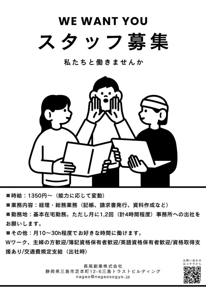 長尾創業では、経理・総務部門のサポートスタッフを募集しています。